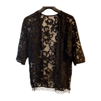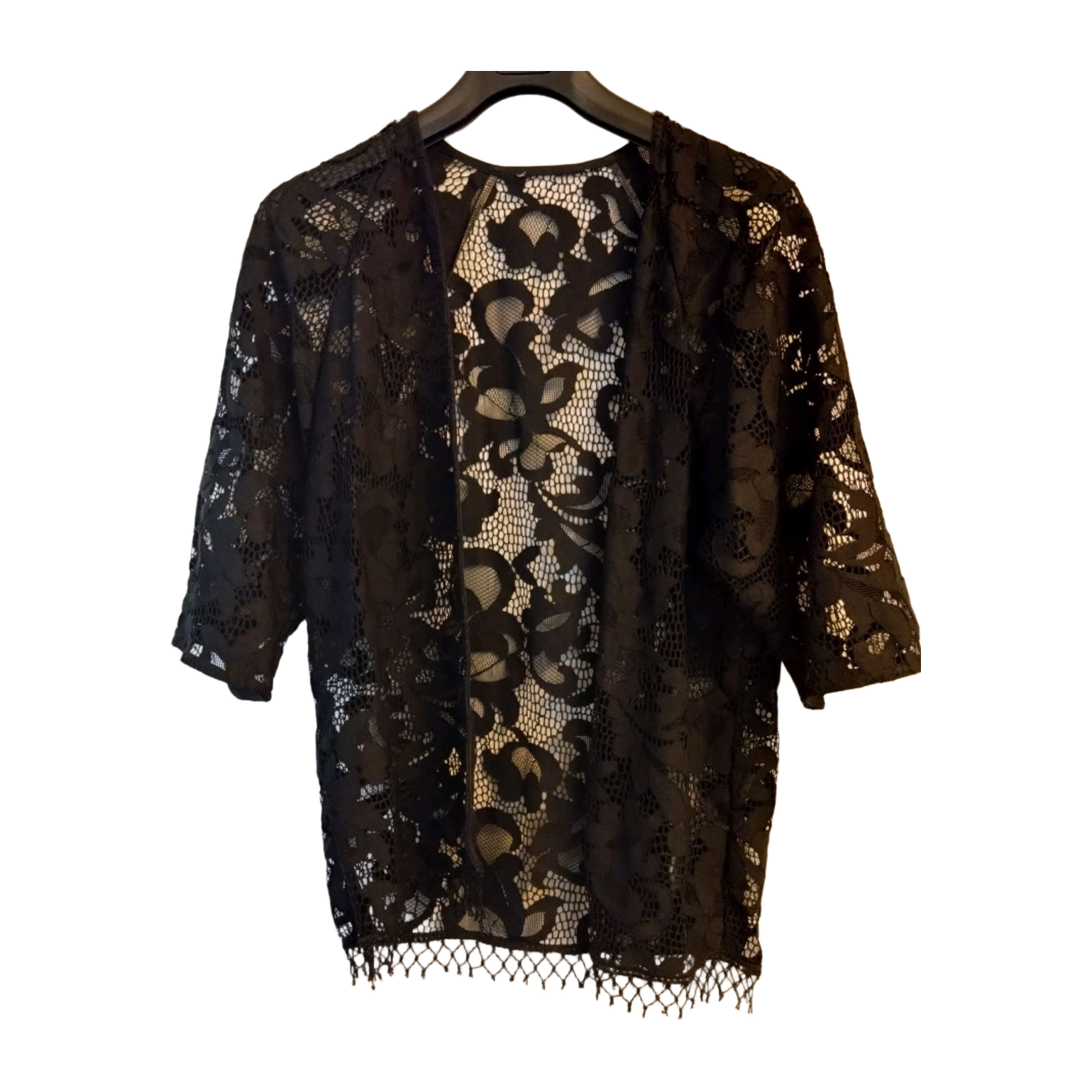 Musta, pitsinen jakku/paita. Väljä malli, edestä avoin. Pituus olalta helmaan n. 65 cm. Aikoinaan Lindexiltä ostettu, ei lappuja kiinni. Hyvässä kunnossa. #pitsi #pitsitakki #kimonobluse