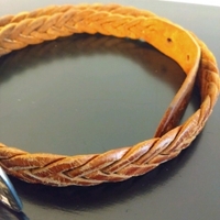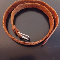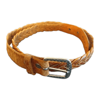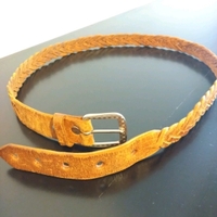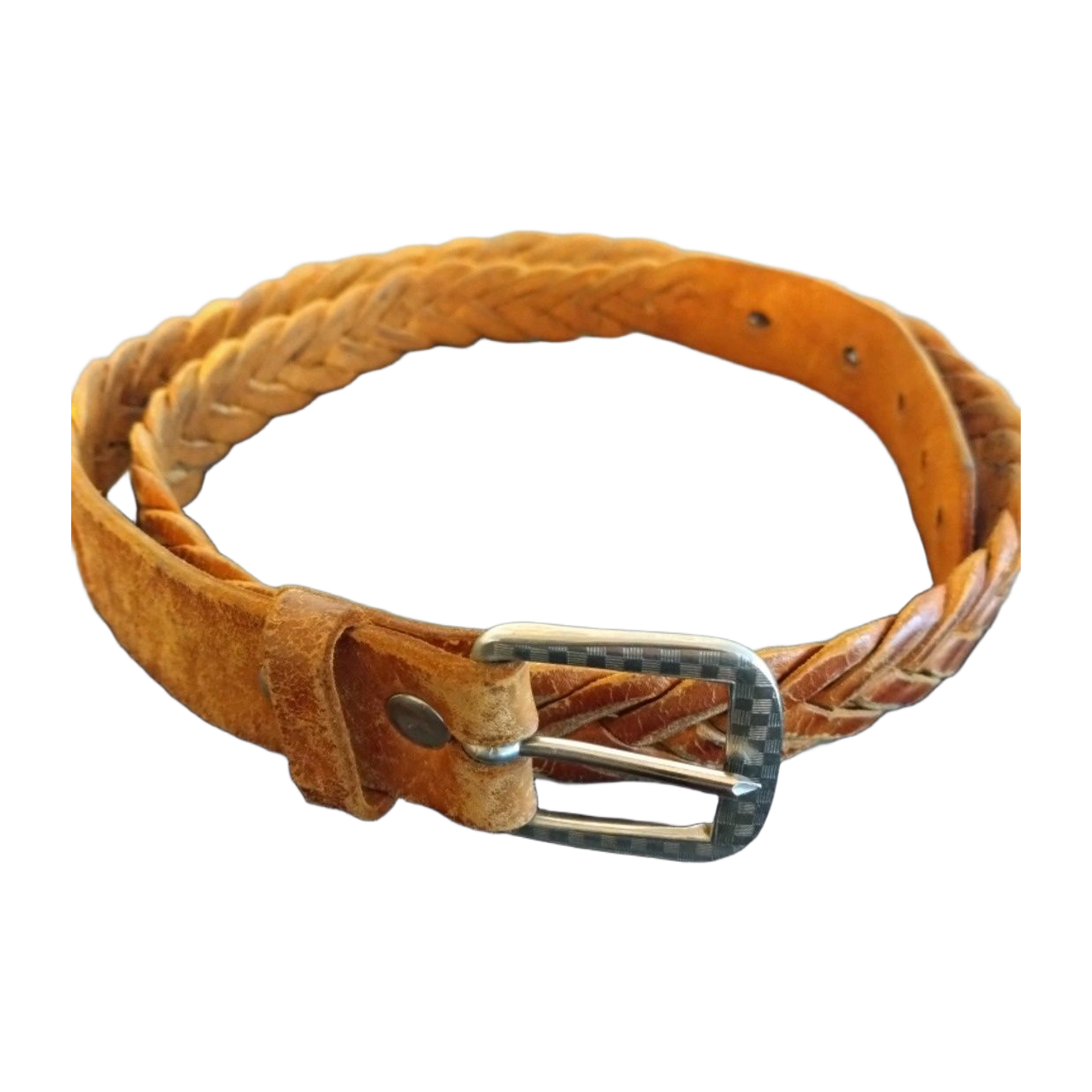 Konjakinruskea punottu nahkavyö, vintagea 70-luvulta. Hopeanvärinen solki. Pituus 90 cm. Pinnassa selkeää kulumaa. #vintage #leatherbelt #vintagebelt #vyö