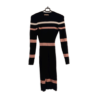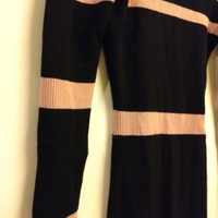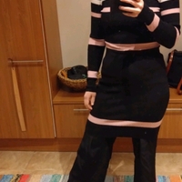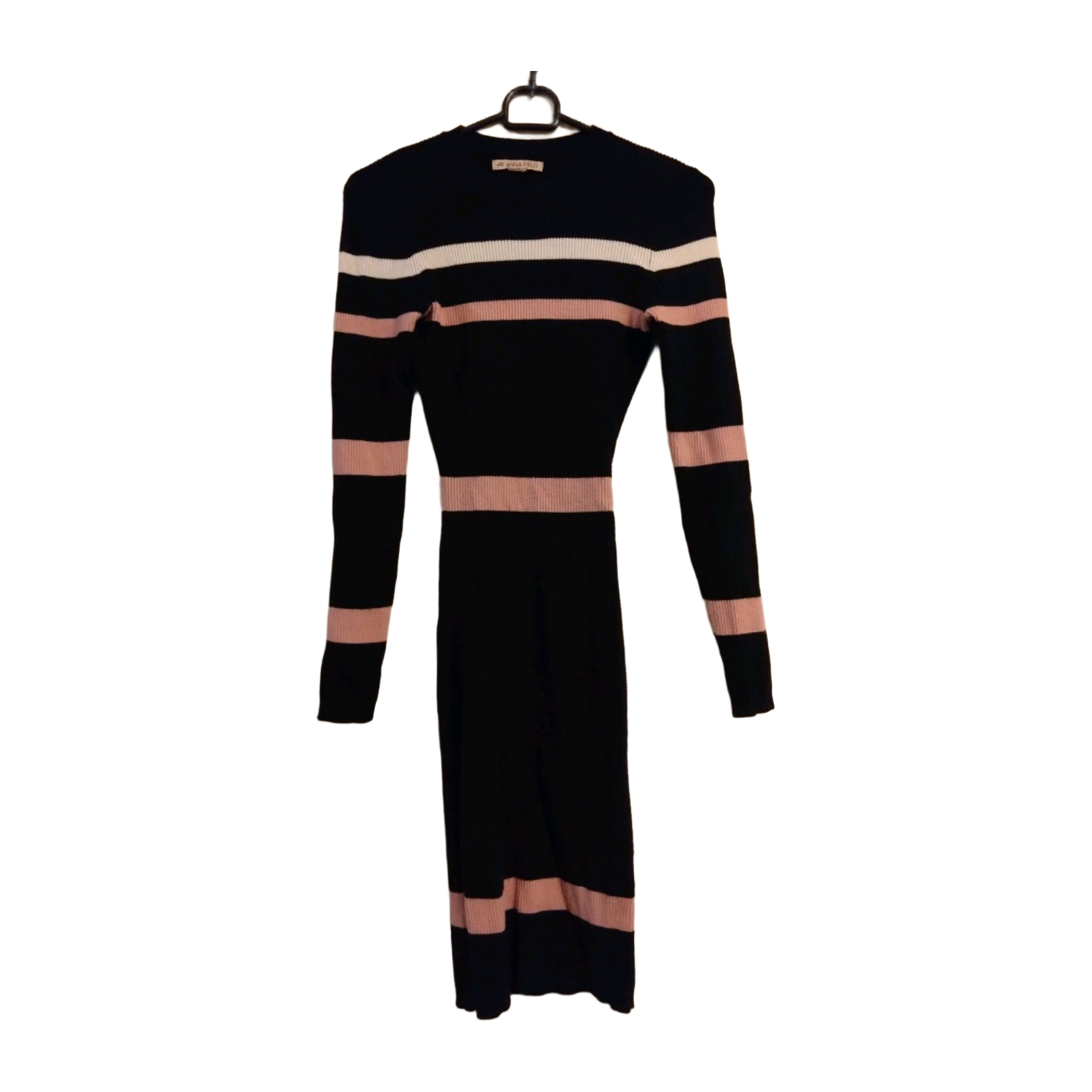 Neulemekko/pitkä neulepaita. Pohja musta, jossa vaaleanpunaiset ja valkoinen raita. Pehmeää, joustavaa materiaalia, mukava päällä. Pituus olalta helmaan noin 95 cm. Koko S, mutta joustaa hyvin. #neulemekko #neule #raitaneule #striped #knitwear