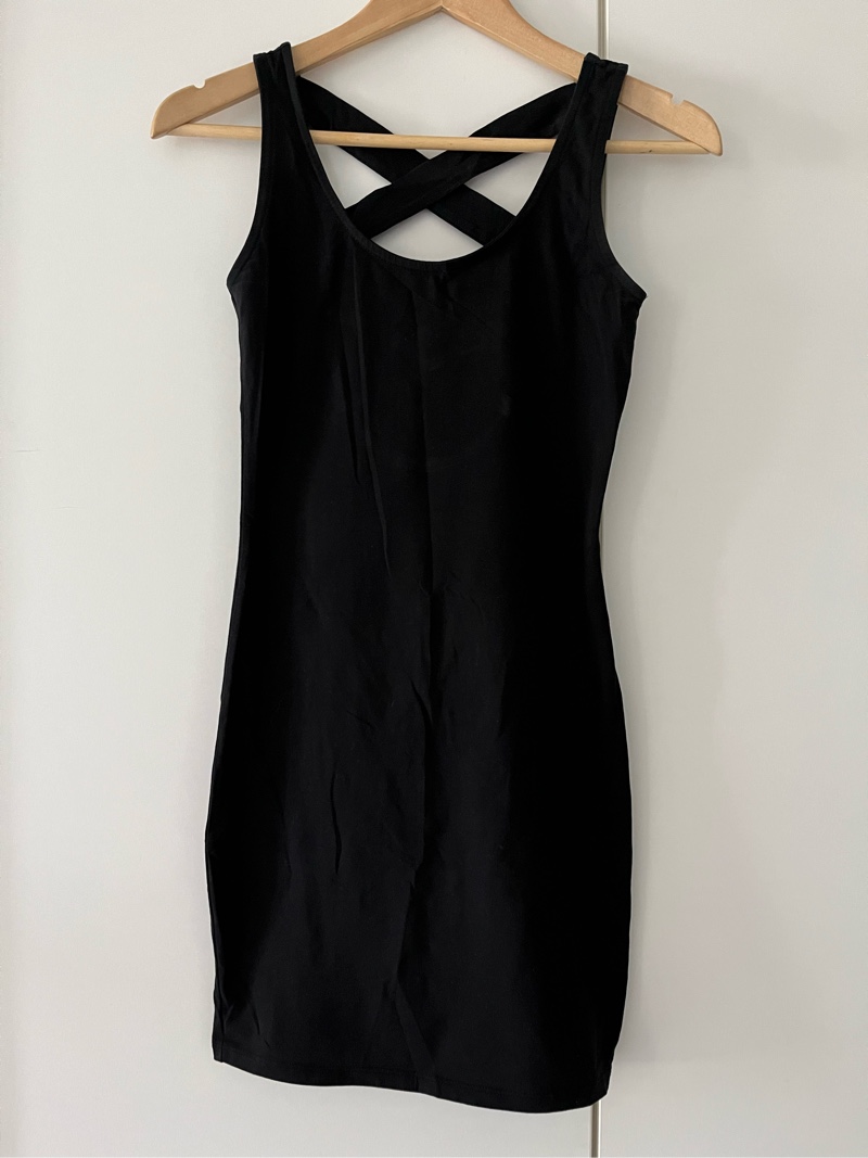 Ihonmyötäinen musta mekko koossa XS. Avoin selkä jossa ristikko. Kunnossa ei moitteita