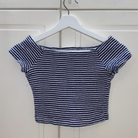Lyhyt valko-tummansini-raidallinen off shoulder -ribbipaita. Käytetty kerran.