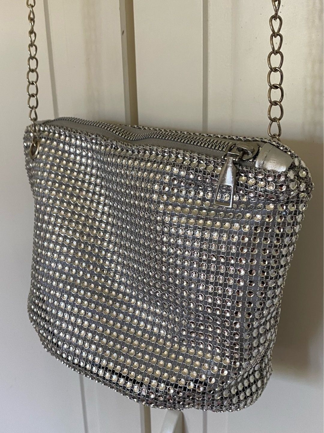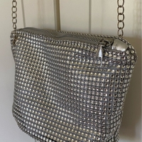 Uusi ja käyttämätön kimalteleva hopeinen pikkulaukku. Olkaketju 120 cm, laukun koko n. 22 cm x 10 cm x 15 cm.