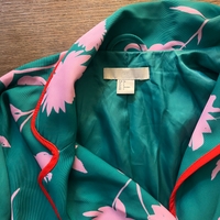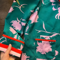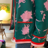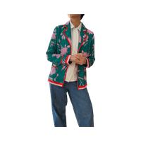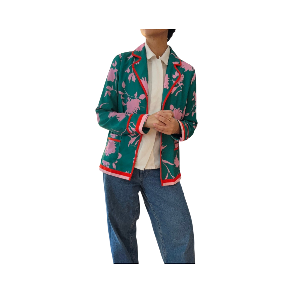 Vihreä bleiseri pinkeillä ja uniikeilla kukkakuoseilla ja punaisilla reunoilla.
