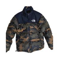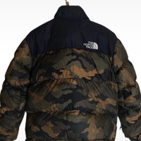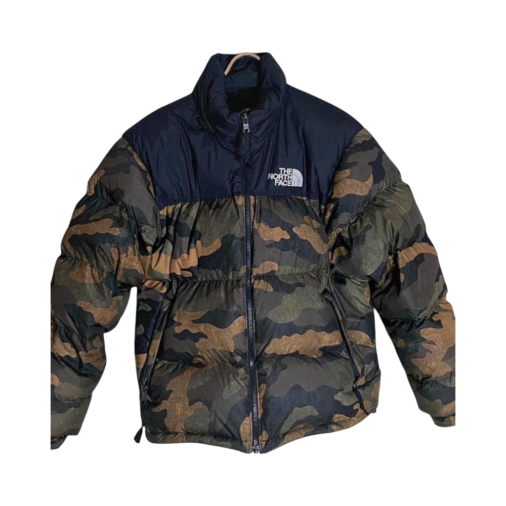 The North Face vintage down jacket with camo pattern and black shoulder section.