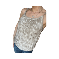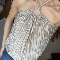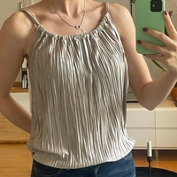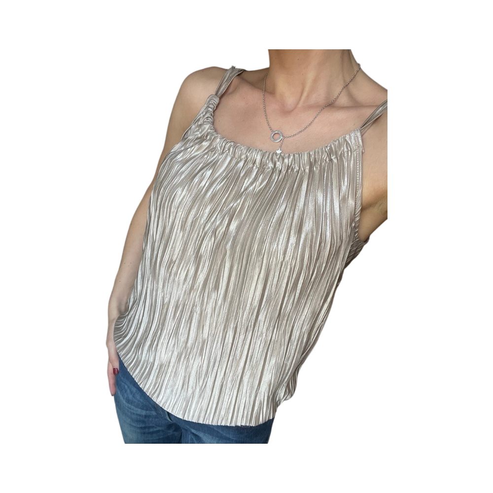 Hihaton pliseerattu juhlava toppi, metallinhohtoinen beige. Ostettu second-handina.