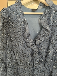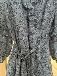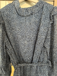 Sininen kuviollinen mekko röyhelöillä ja vyöllä. Koko M. Hyvässä kunnossa.