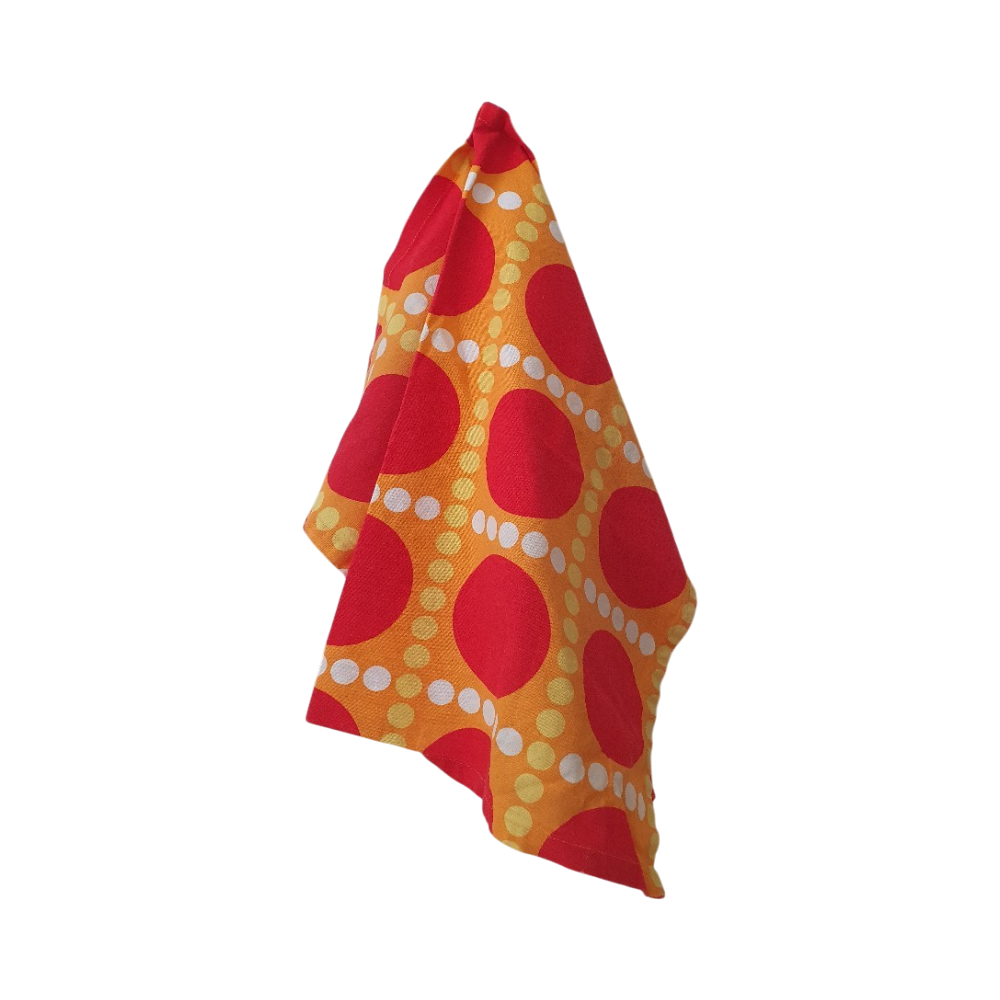 Aarikan keittiöpyyhe, jota käytetty pari kertaa ja pesty. Pari pientä pistemäistä jälkeä