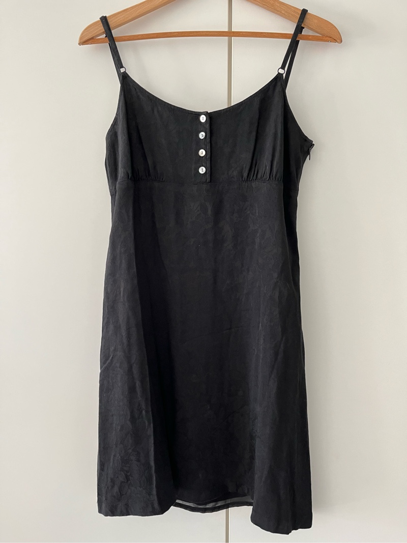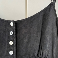 Part Twon musta mekko koossa 38. Säädettävät olkaimet, piilovetoketju sivussa, nappiyksityikohdat edessä ja kankaassa kukkia. Ollut mun suosikki mekkoja ja ollut toki käytössä mutta edelleen hyvin siistissä kunnossa
