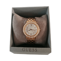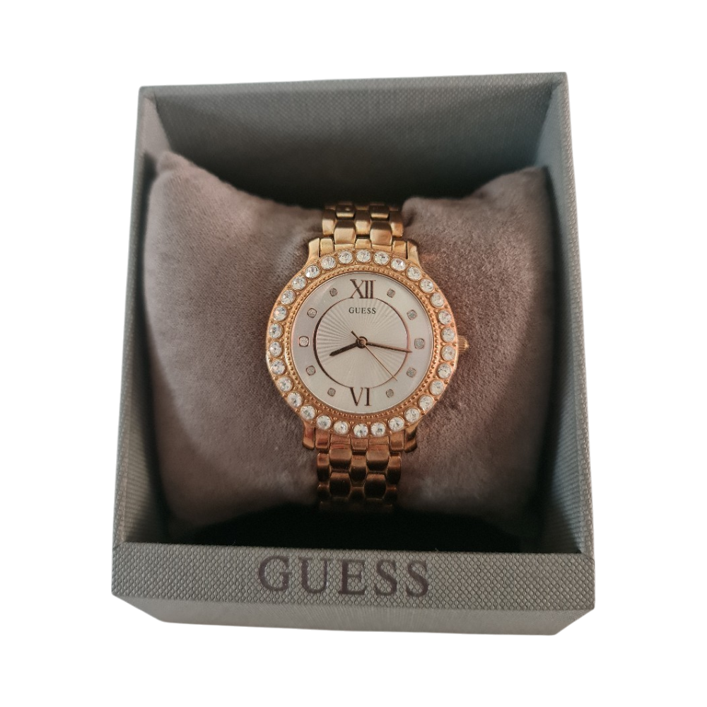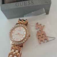 Guessin rannekello. Yleiskunto hyvä, vaatii pariston vaihdon. Jatkopaloja löytyy ja laatikko sisältyy kauppaan.