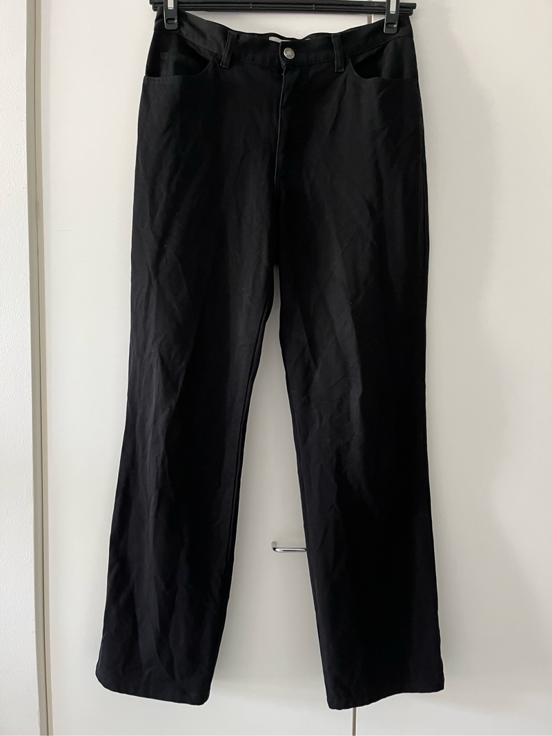 Mukavat mustat leveälahkeiset housut. Taskut edessä ja takana. Tuotelappu kulunut mutta menevät suunnilleen M kokoiselle. Olleet ihan suosikki housut ja paljon käytössä mutta siitä huolimatta edelleen siistissä kunnossa