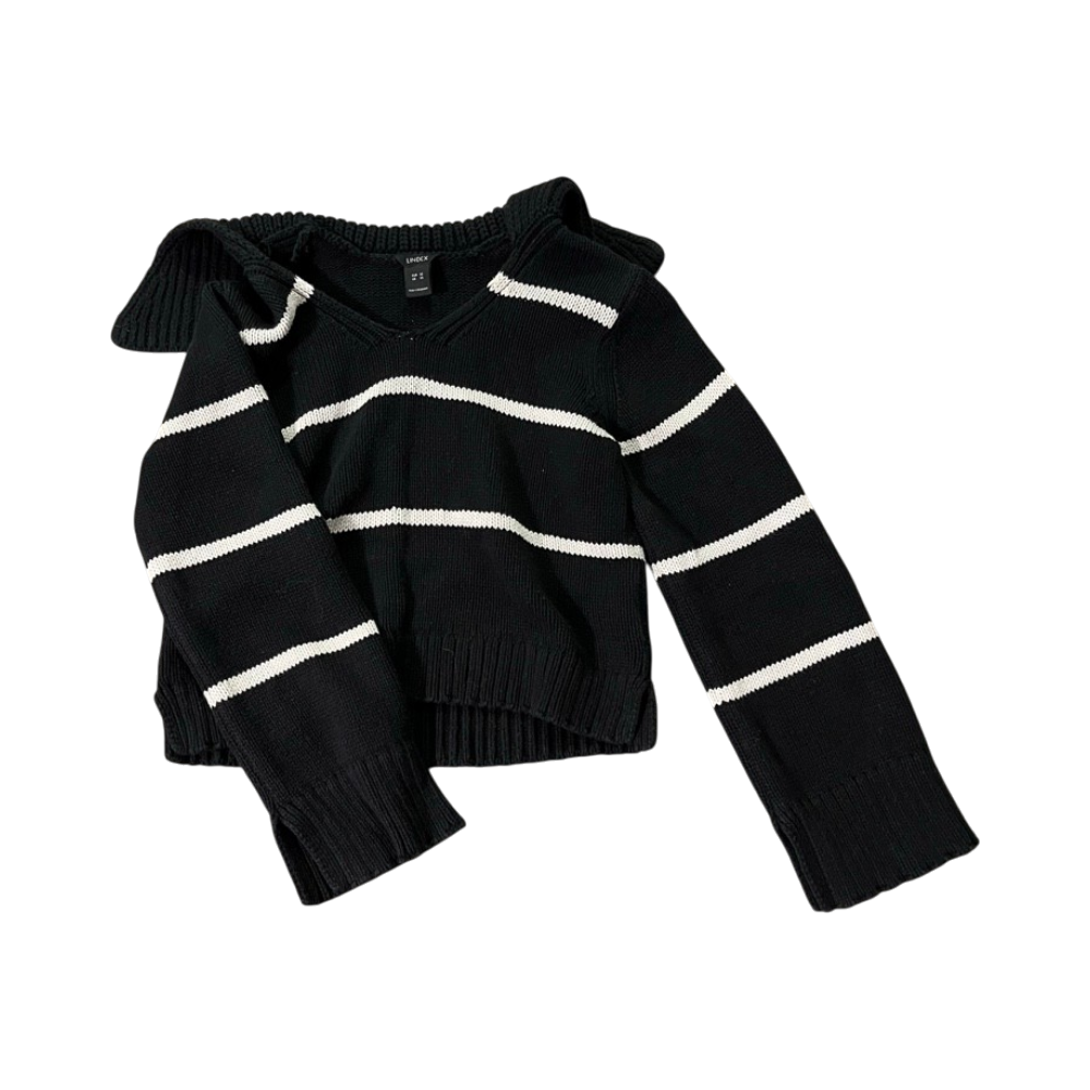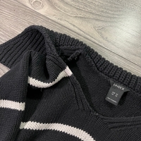 Lyhyt, raidallinen villaneule, V-pääntie, pitkät hihat.