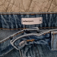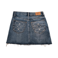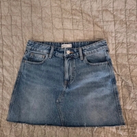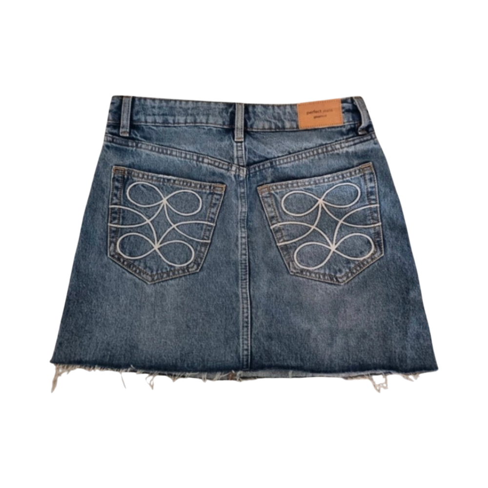Denim-minihame, kulutettu reuna ja koristetaskut.