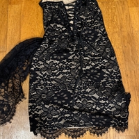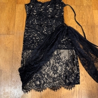 Musta korsettityylinen pitsimekko, nyöritys ja drapeeraus.