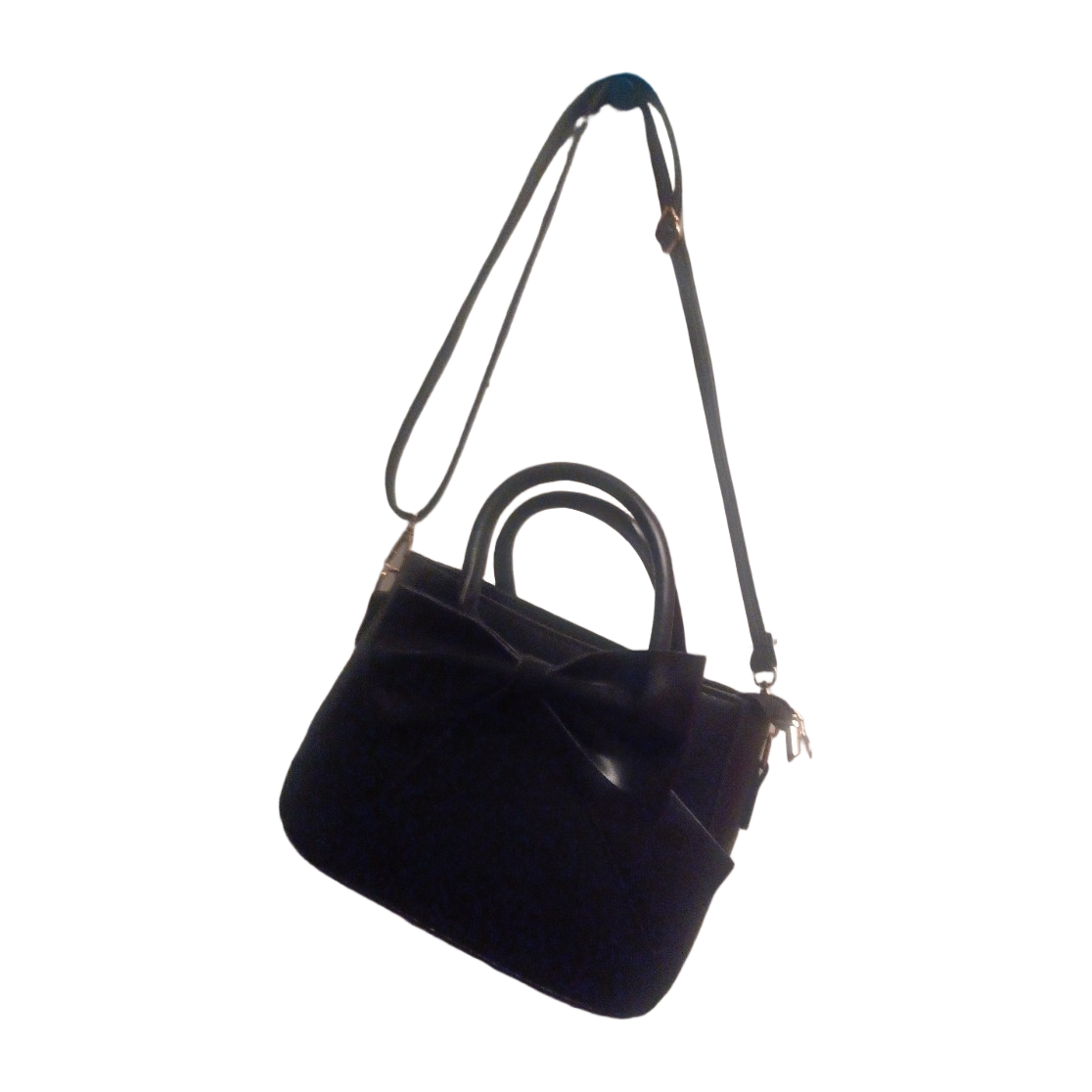 Naisten musta rusetilla koristeltu käsilaukku, tyylikäs ja käytännöllinen. Saatu lahjaksi eli uusi, mutta tuotteessa ei lappuja. Jotain keinonahkaa tms materiaaliltaan. Säädettävä hihna,sisällä ei taskuja.