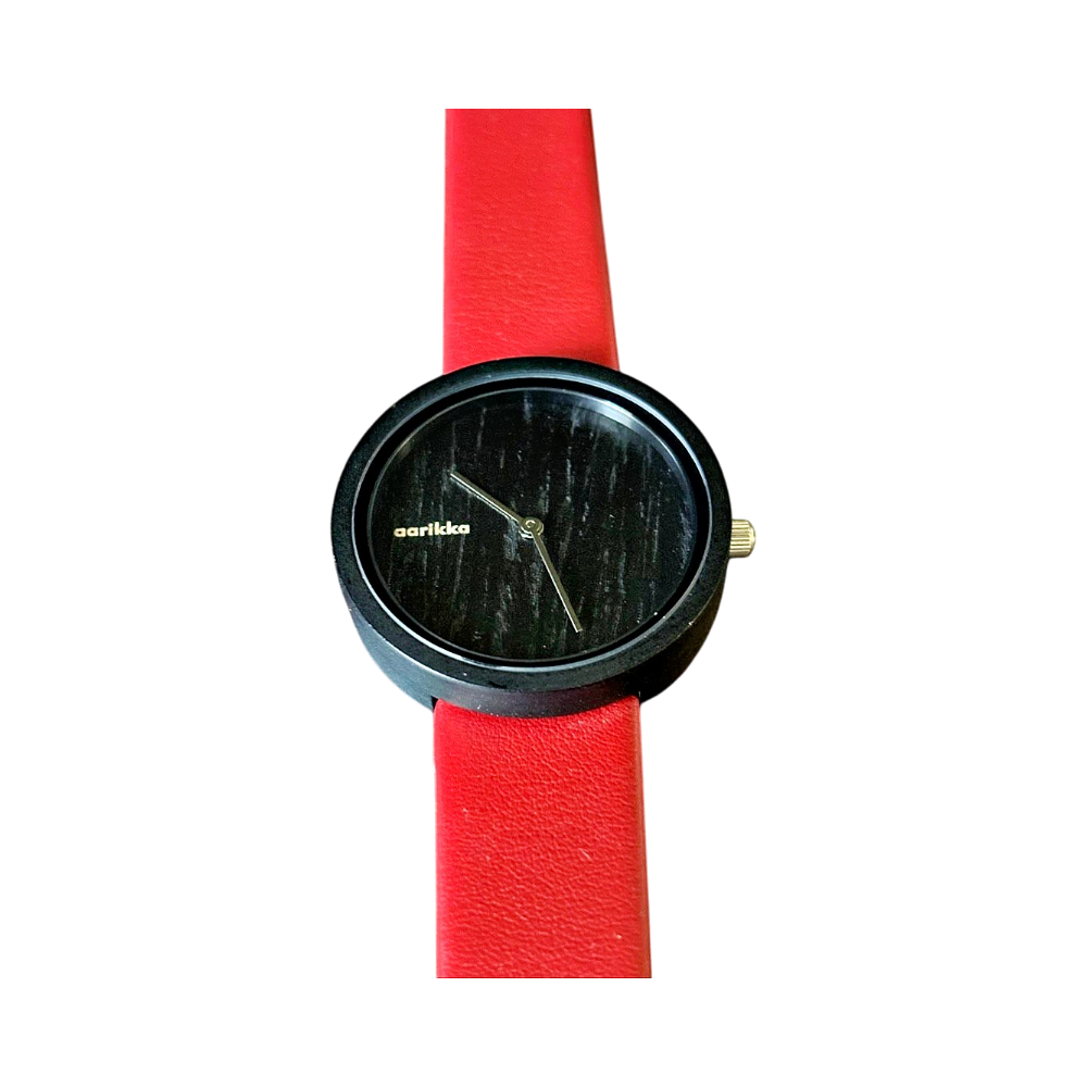Pari kertaa käytössä ollut Aarikka -rannekello, joten kunto lähes uudenveroinen. Pituus 22 cm, kellotaulun halkaisija 35 mm. Ranneke aitoa nahkaa. Toiseksi viimeisen kiinnitysreiän kohdalla parin millin mittainen hyvin haalea naarmu (toiseksi viimeinen kuva).