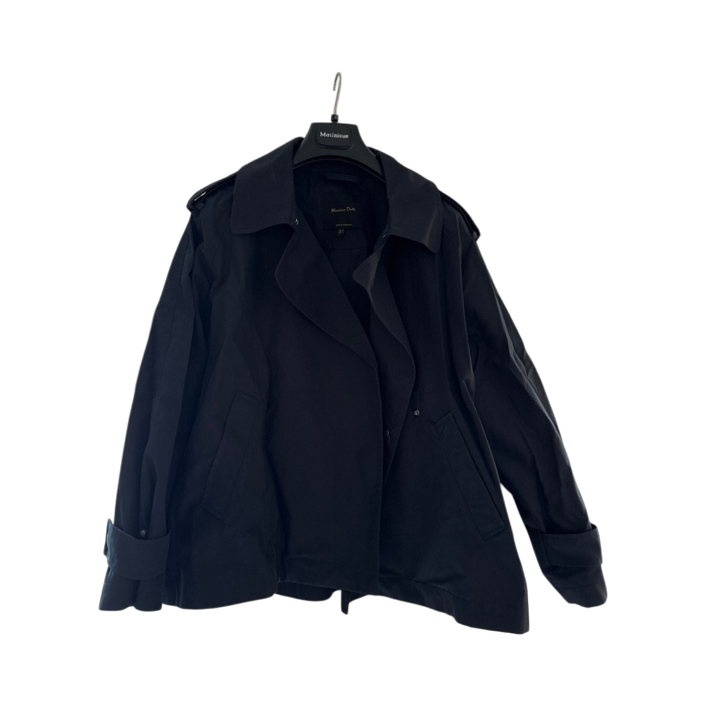 Lyhyt tummansininen trenssi, tyylikäs ja hyväkuntoinen.
