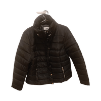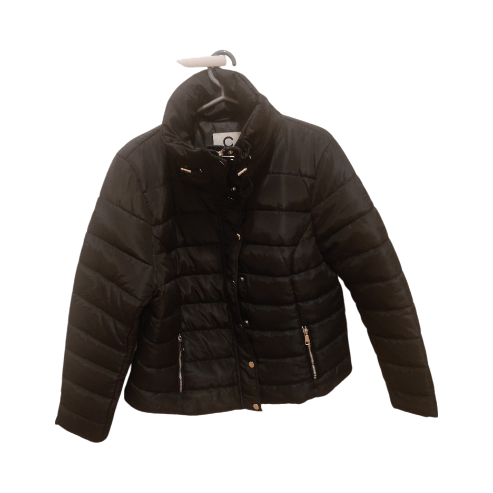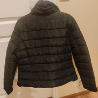 Kevyt musta toppatakki, vetoketjulliset taskut, toppaus.