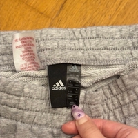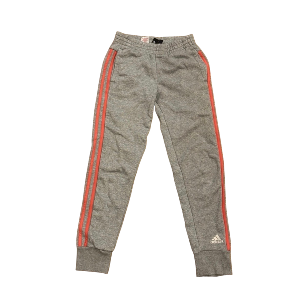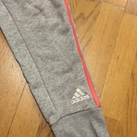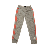 Harmaat housut, joissa tyylikkäät raidat sivuilla ja ikoninen adidas logo vasemmassa lahkeessa.