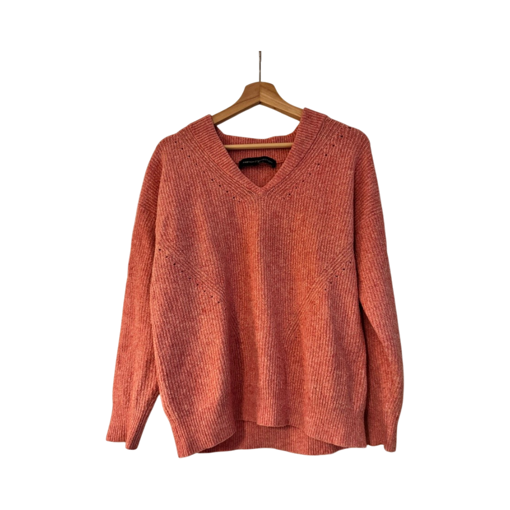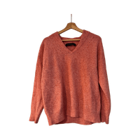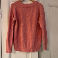 Käytetty, mutta edelleen hyvässä kunnossa! Pinnassa on vähän nukkaa pesujen jäljiltä. Kuvat vähän vääristää väriä, neule on vaaleanpunainen, kuvissa se näyttää vähän lohenpunaiselta. Koko on M, mutta neule menee hyvin myös L kokoiselle! Materiaalista 14% puuvillaa, 7% villaa