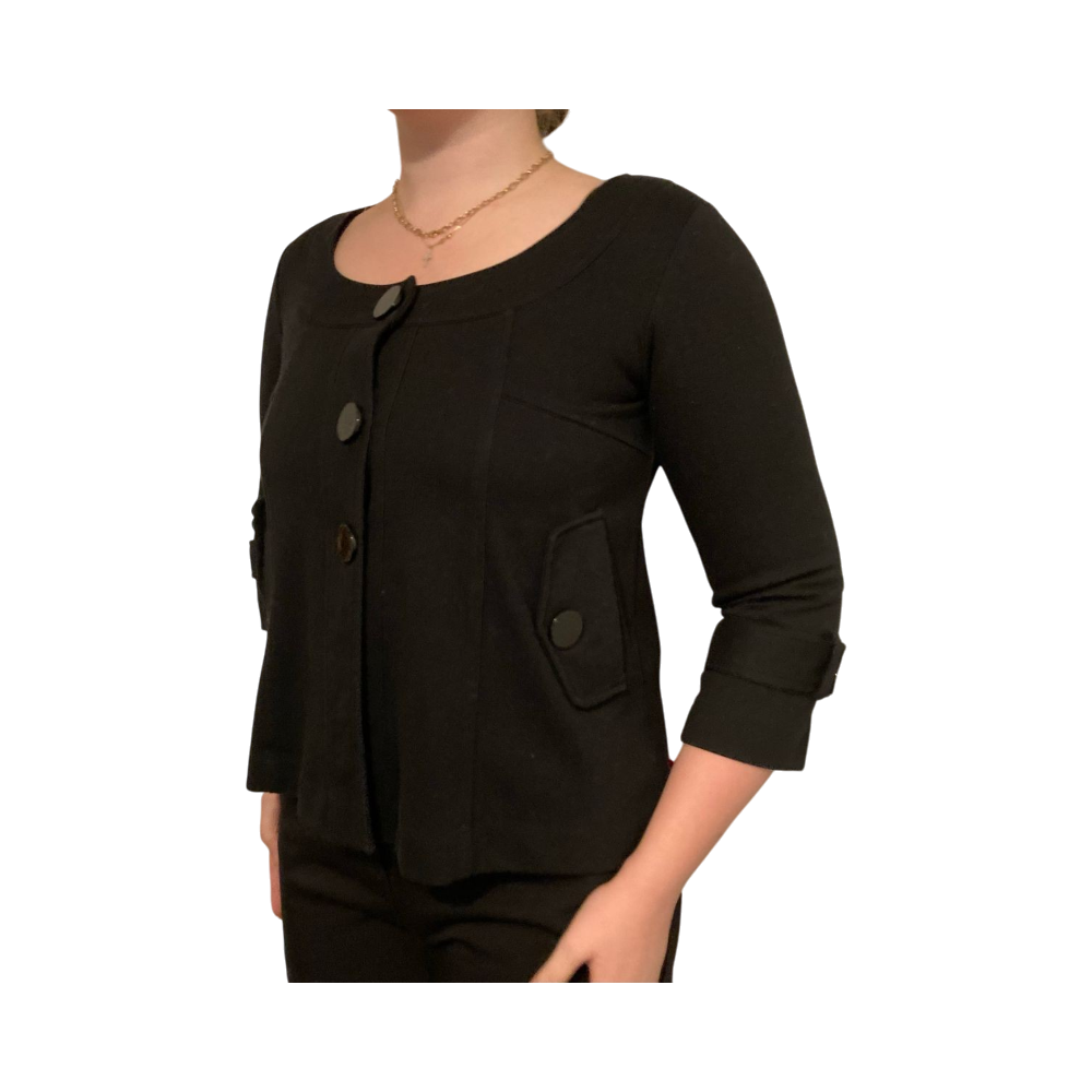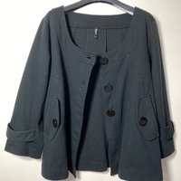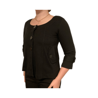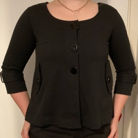 Edessä napitus ja isot taskut, joissa korosteläpät ja -napit.