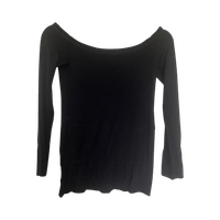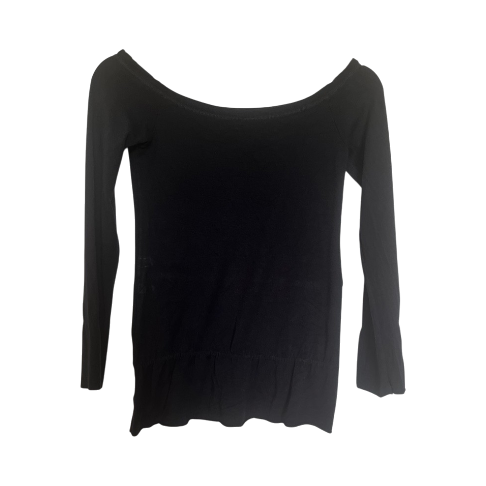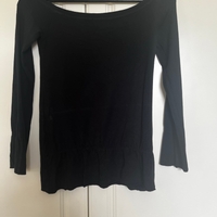 Pitkähihainen, vartaloa myötäilevä musta pusero.
