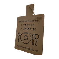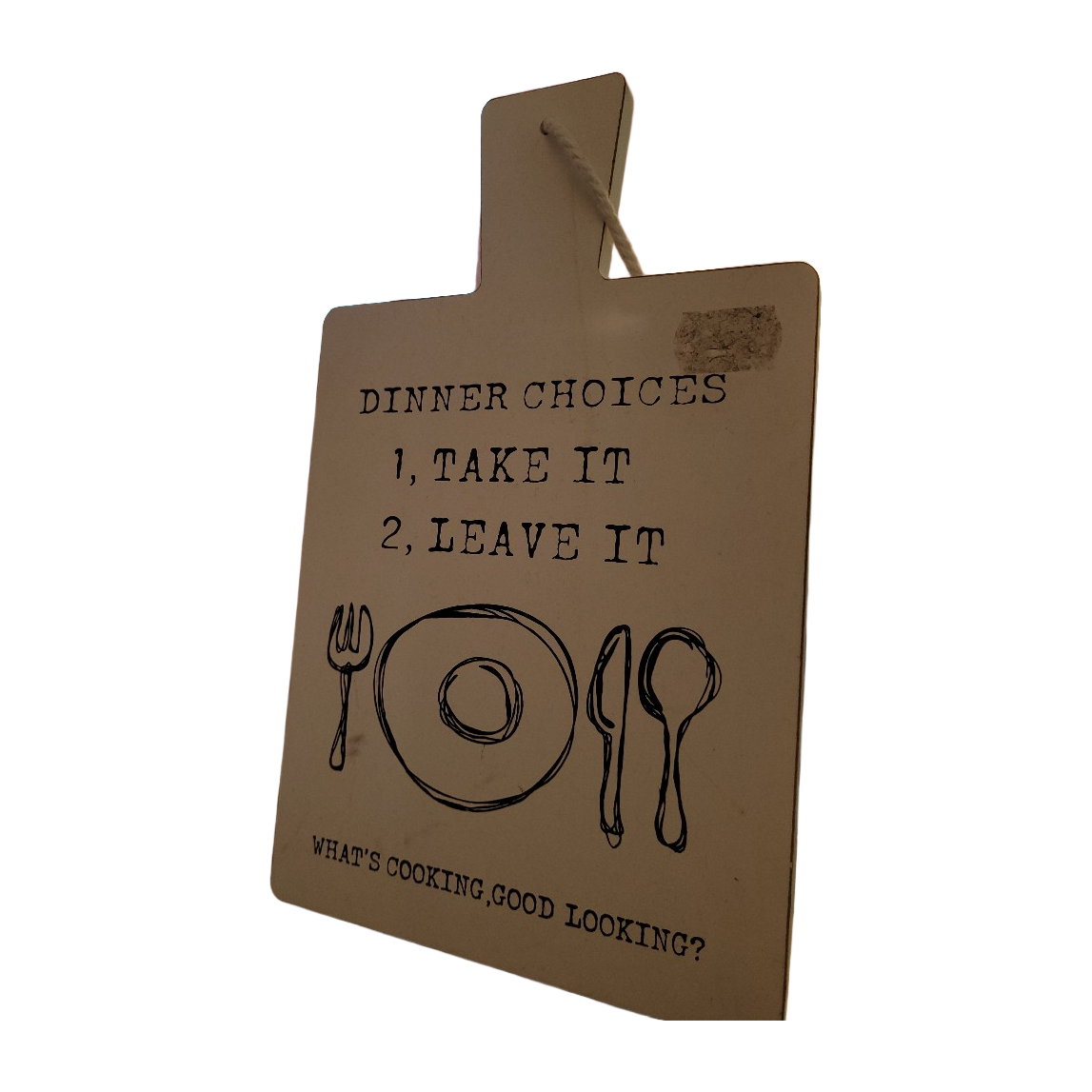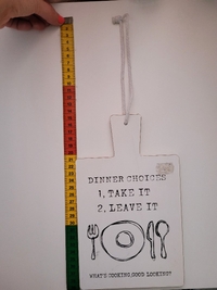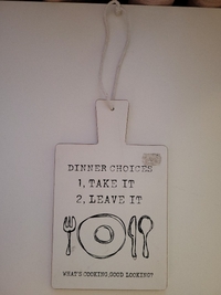 Valkoinen 4Living Collection sisustustaulu tekstillä Dinner choices. Kuvissa mitat. Kiinnitys narulla. Ehjä, pientä puhdistusta saattanee tarvittaessa tarvita.