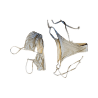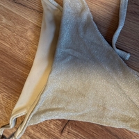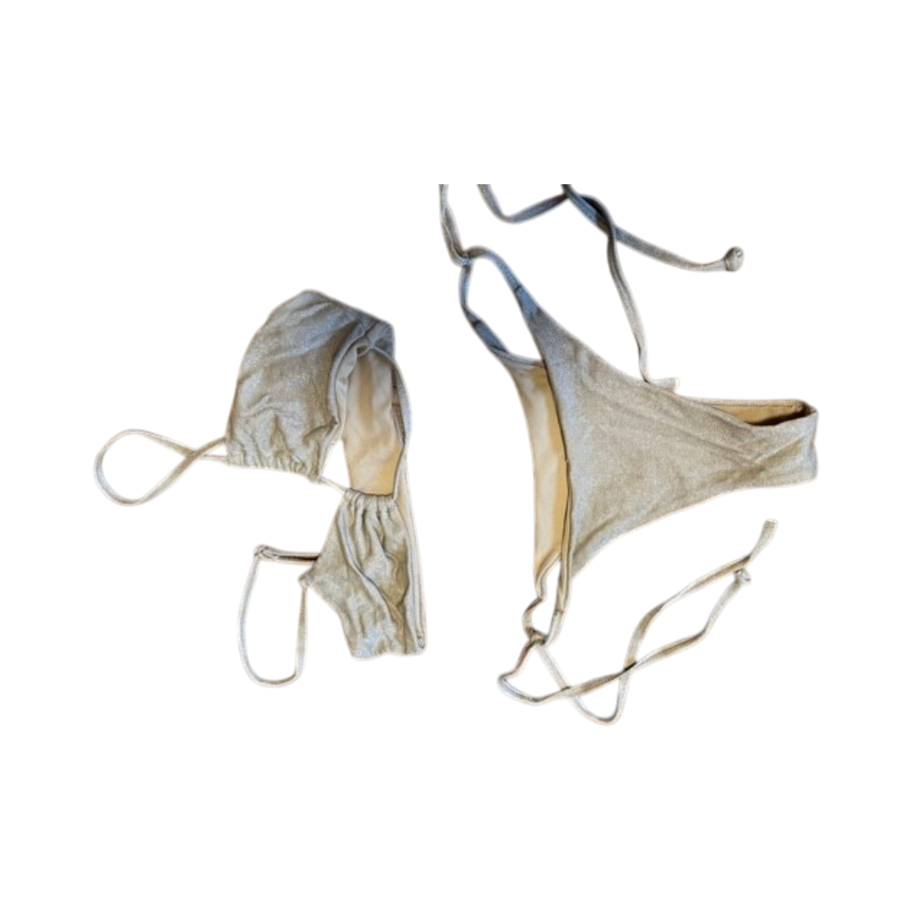 Two-piece gold shimmer bikini, triangle top and tie-side bottoms.