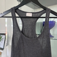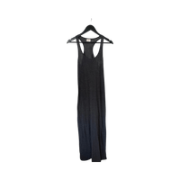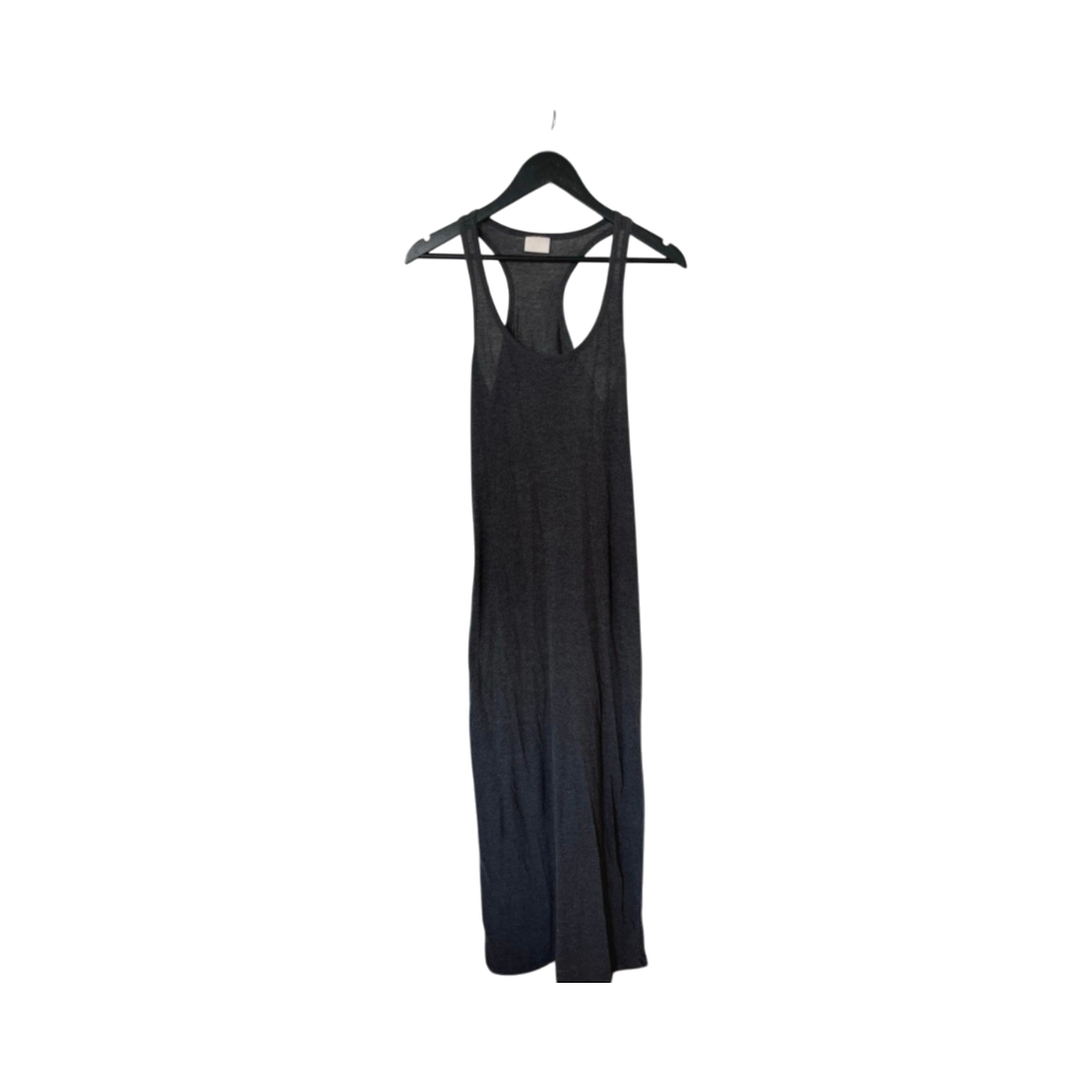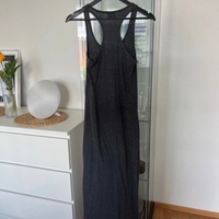 Pitkä hihaton mekko, kangas on väriltään hieman nukkaisen näköinen mutta on myös hieman nukkaantunut, koko on mielestäni joustava xs-m, kainalo-helma mitta noin 122cm, koko mitta noin 140cm. Materiaalilappu leikattu irti mutta kevyt kangas