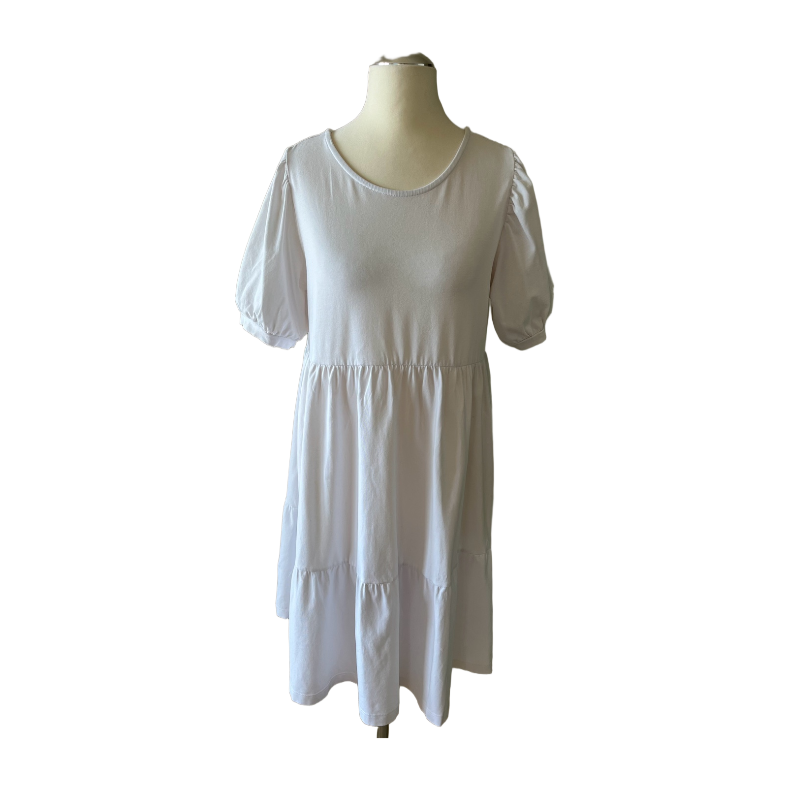 Valkoinen lyhythihainen AJLAJK mekko. Sarastus-mekon mallinen, mutta laadukasta puuvillatrikoota. Ollut kerran päällä ja uuden veroinen.