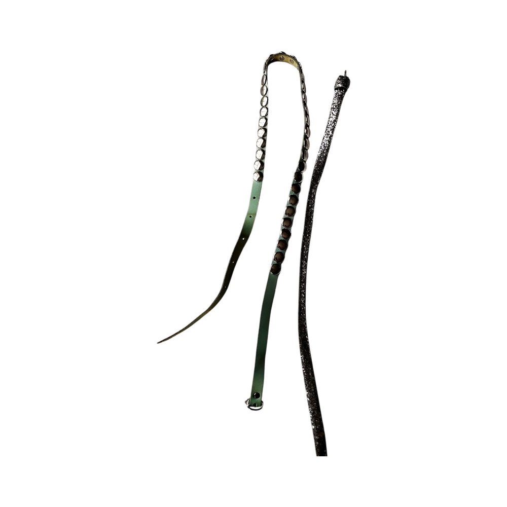Kaksi naisten vyötä, hopea ja vaaleansininen niittivyö.