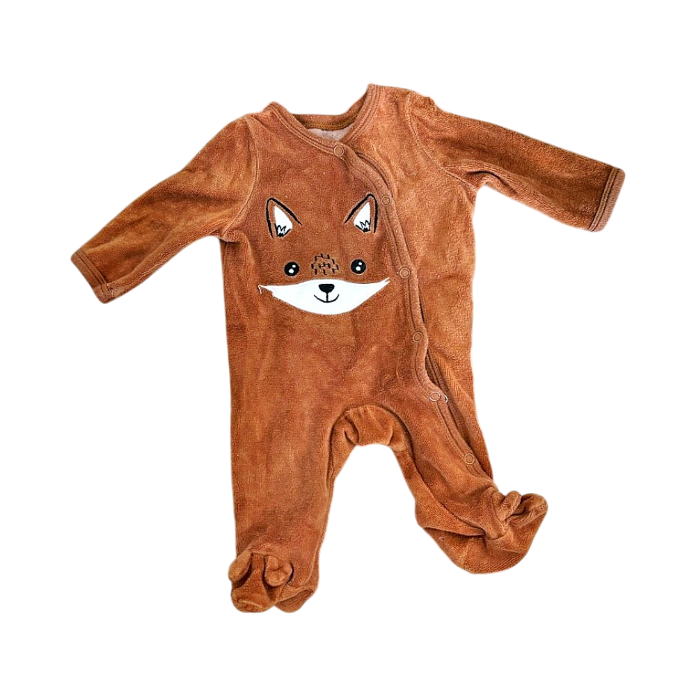 Pehmeä ruskea vauvan haalari/ potkupuku/ yöpuku. Ketun kuva edessä. Koko 56, mutta pientä mitoitusta, joten menee ennemmin koossa 50. Hyvä kunto.