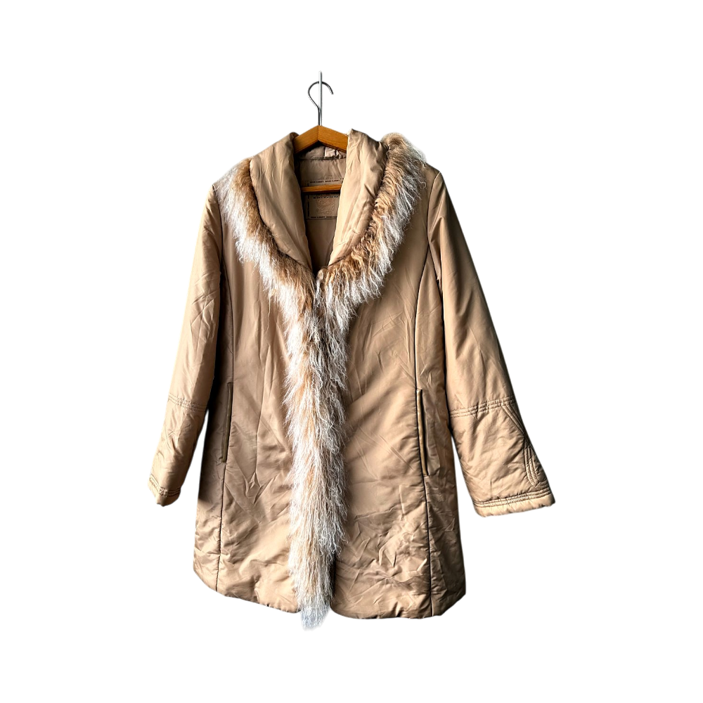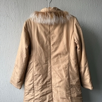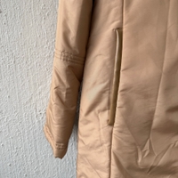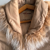 Gerry Weber beige kevyesti topattu takki. Väljä, puolipitkä malli. Takissa tekoturkiskaulus ja kiinnityshakaset edessä. Koko 36, kainalo-kainalo 56 cm ja pituus 85 cm. Toisessa hihassa pientä likaa (viimeinen kuva).