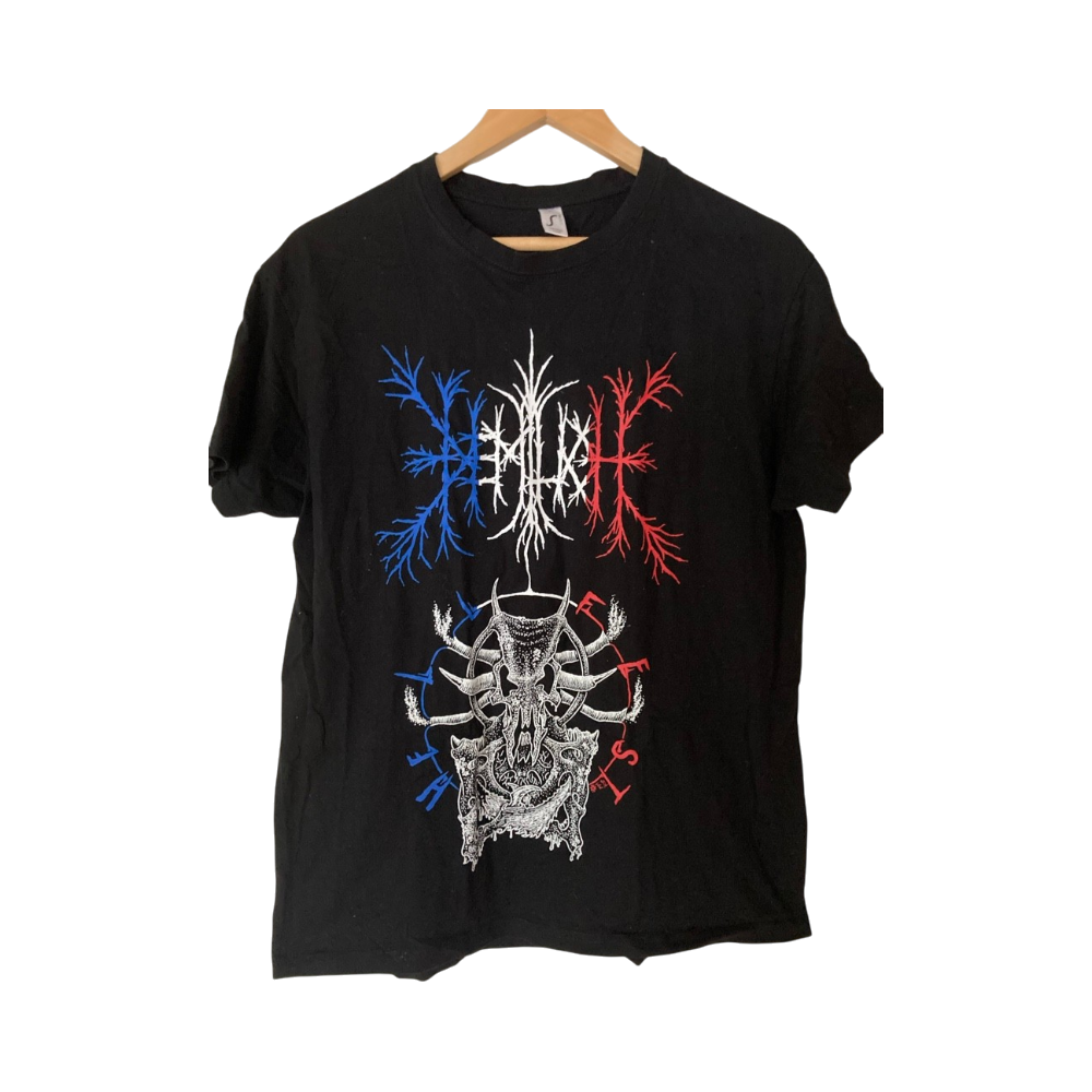Leikkaamattomasta kokolapusta päätellen ostettu kyseisiltä festareilta, en tiedä saako näitä vielä bändin jätkiltä, vai pitivätkö lupauksensa polttaa myymättä jääneet. Mutta tässä olisi, hyväkuntoinen vielä kaiken lisäksi. Sol’s, L-koko, 100% puuvillaa.