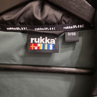 Vihertävän/Turkoosin värinen Rukka Vestra, pitkä parkamallinen kevyesti topattu takki koossa D48. (ovh. 199,95€). Vastaa ennemmin kokoa 50-52.)
