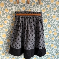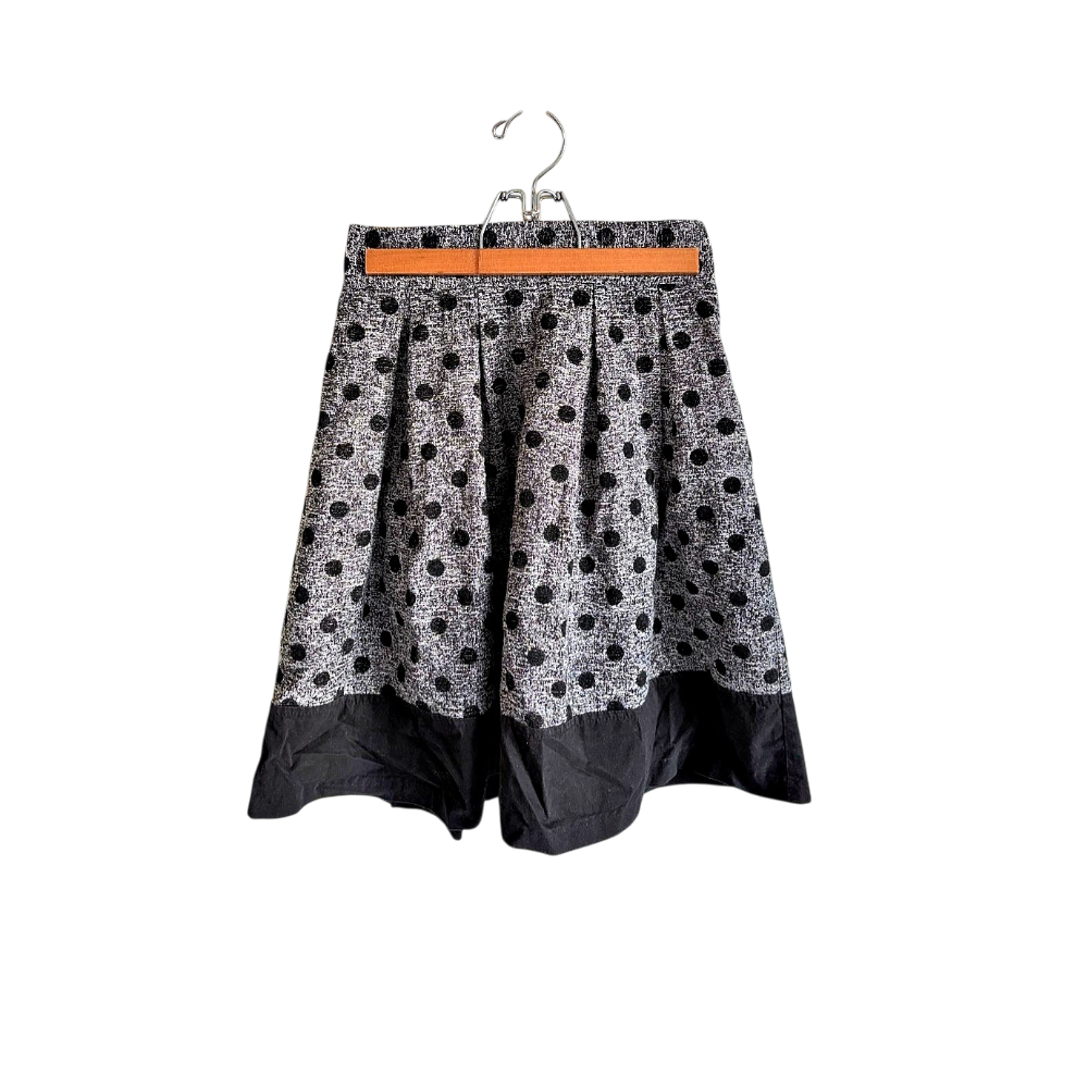 Mustaharmaa pilkullinen kellohame, jossa resori vyötäröllä ja vetoketju.