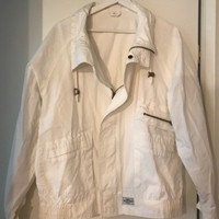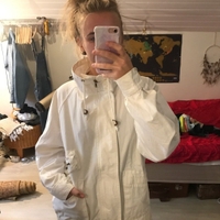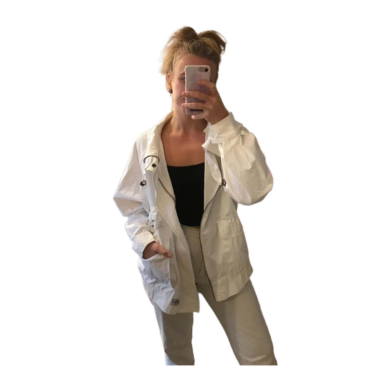 valkoinen vintage kevyt takki! edessä kaksi taskua sekä pieni vetoketjullinen tasku. kiristysnauhat kauluksessa. s koko lapussa mutta vastaa enemmän ehkä m kokoa, luultavasti L kokoon asti sopiva halutusta fitistä riippuen. vintage iästä johtuen takissa hieman elämän merkkejä kuten esim takana hieman mustia jälkiä joita ei ole yritetty pestä pois, muuten tosi siistissä kunnossa.