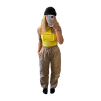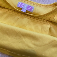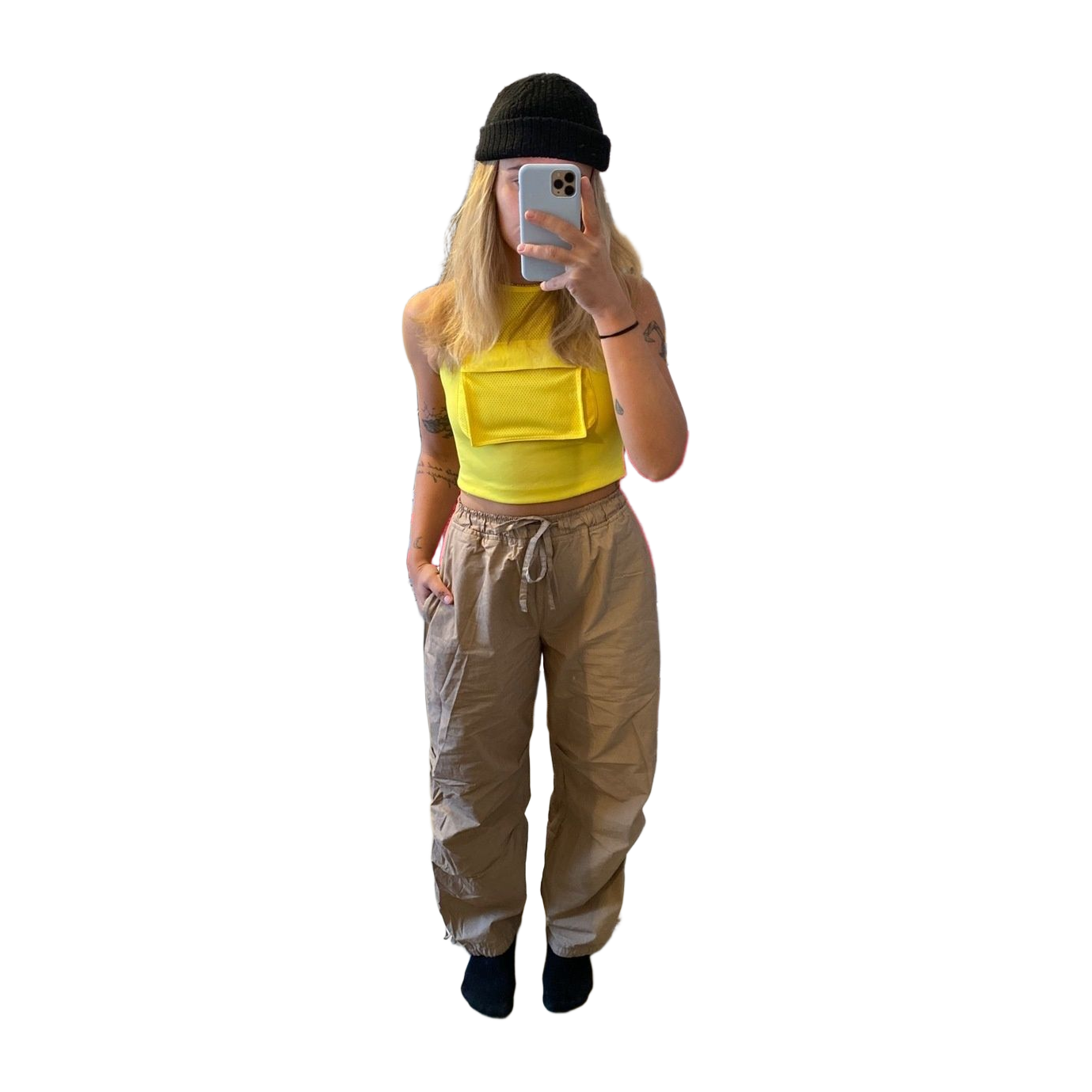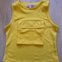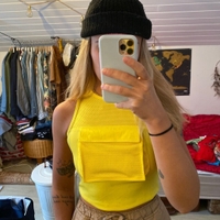 kirkkaan keltainen 90 luvun toppi, edessä iso tasku, vikassa kuvassa koko ja paidassa olevat pienet virheet jotka ei kuitenkaan omasta mielestä näy päällä ollessa ✨ lasten toppi alunperin, mutta toppi venyvää kangasta, omat mittani näkee profiilista