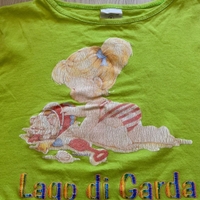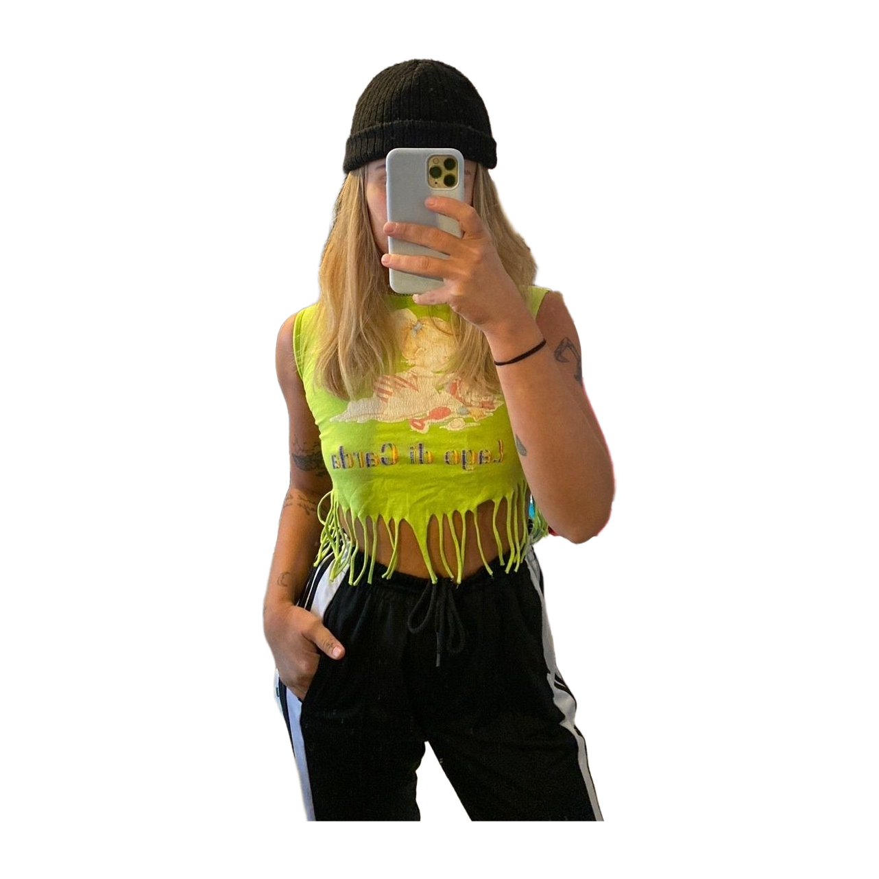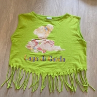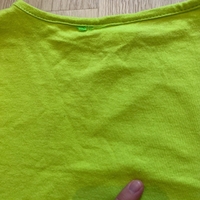 lime vihreä hapsu toppi kuvalla, printin kunnon näkee kolmannesta kuvasta, takana ihan pieni reikä sekä ompelukone virhe neljännessä kuvassa. lasten toppi alunperin, omat mitat profiilissa - itselle kainaloista hieman pieni