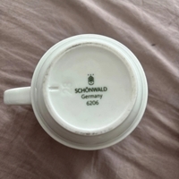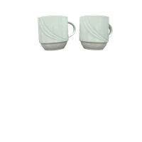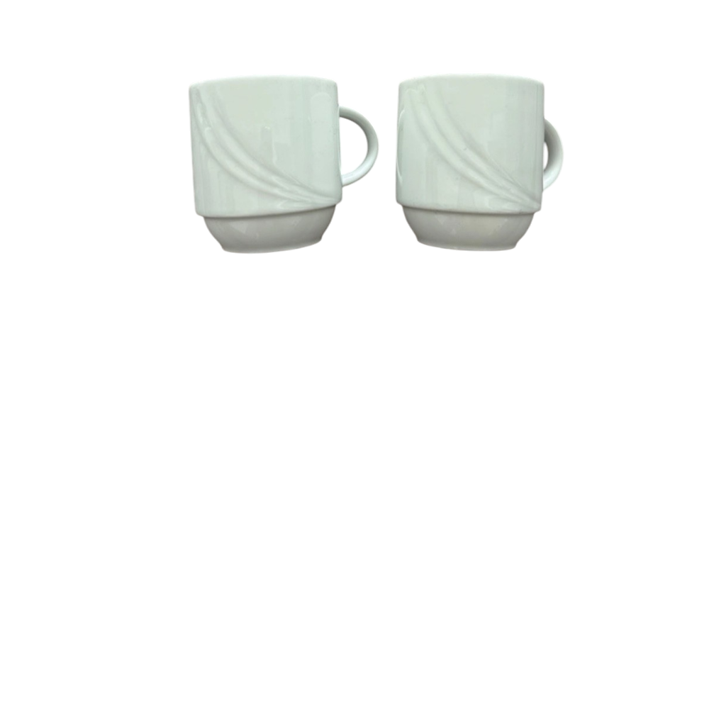 Kaksi valkoista posliinimukia, yksinkertainen kohokuviointi.