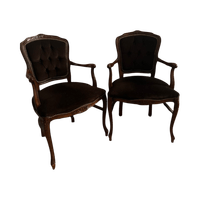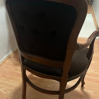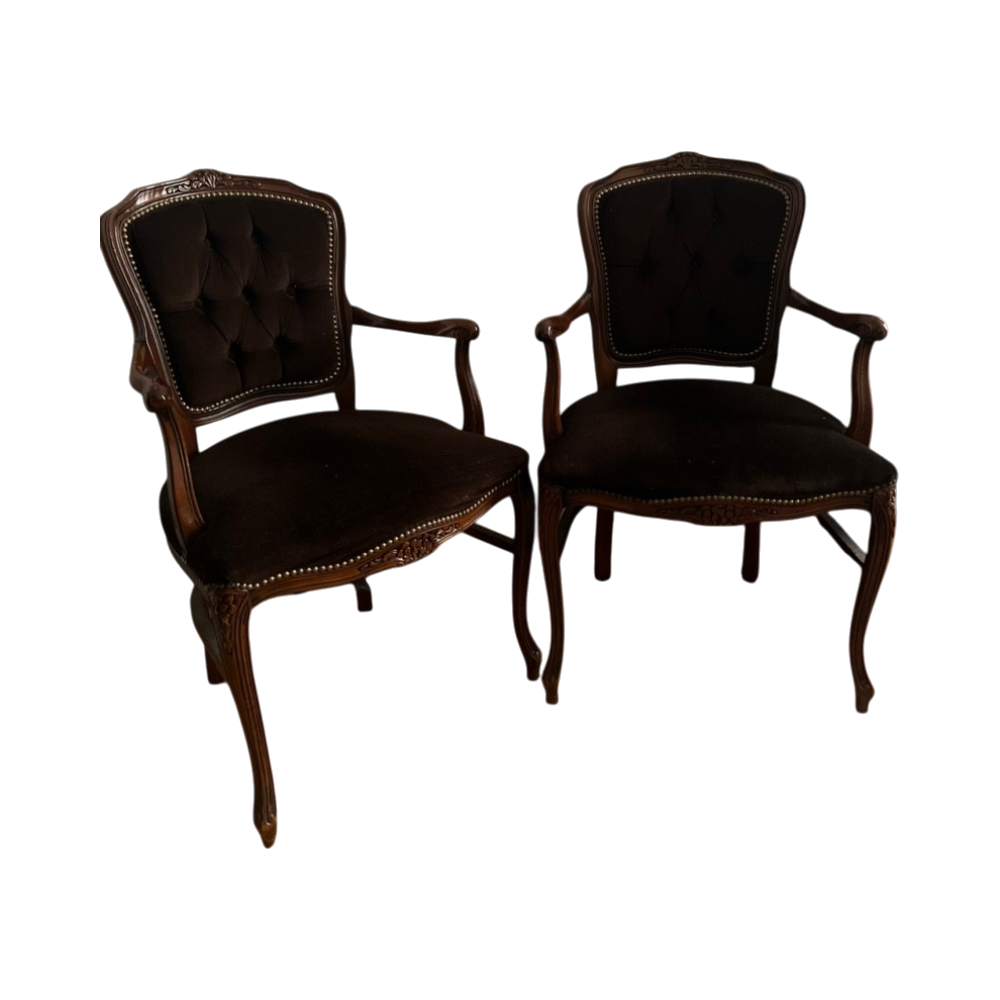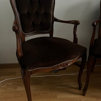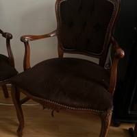Kaksi koristeellista puutuolia, verhoiltu, patinoitunut kunto. Istuinosien verhoilu alapuolelta repsottaa.