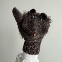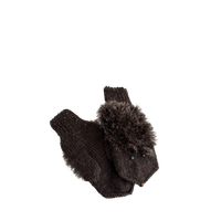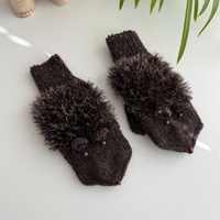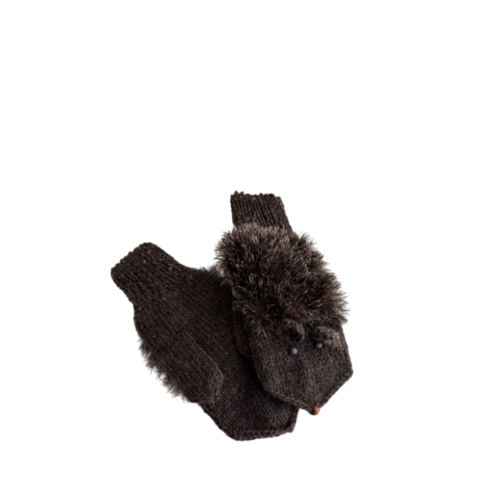 Ruskeat käsintehdyt siililapaset. Kämmenosa 17 cm ja koko lapanen 24 cm. Tehty villalangasta.