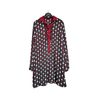 Koko on 42 mutta malli on hyvin joustava, käytän normaalisti M-kokoa ja mekko sopii silti erinomaisesti eli todella monikäyttöinen leikkaus. Pituus 92 cm.
