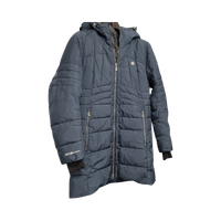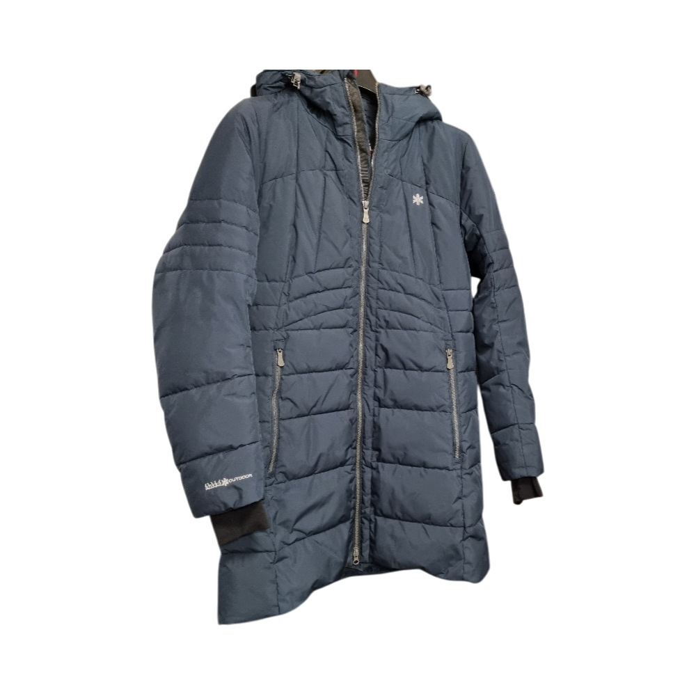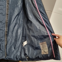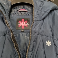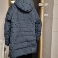 Áhkká-untuvatakki, koko: 42. Tummansininen väriltään. Ei ole pesty, koska en ole kokenut tarvetta. Untuvatäyte edelleen muhkea ja lämmin. Kaksisuuntainen vetoketju. Kiinteä huppu, jossa kiristysnyörit. On ollut käytössä säännöllisesti koko viime talven. Hihojen joustoresoreissa nukkaa sekä yksi parsittu reikä kun on ottanut johonkin kiinni.