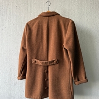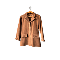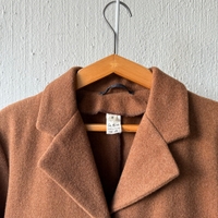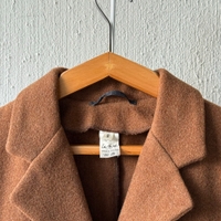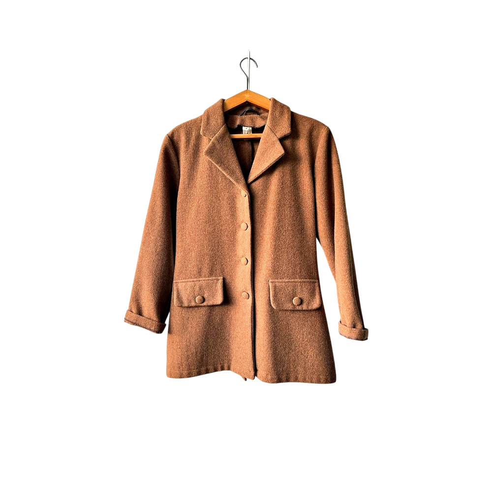 Ruskea suomalainen vintagebleiseri. Koko S, kainalo-kainalo 51 cm ja pituus 72 cm. Materiaalista ei tietoa, kangas melko paksua ja teddy-tyylistä. Ei oikeita taskuja.