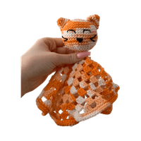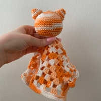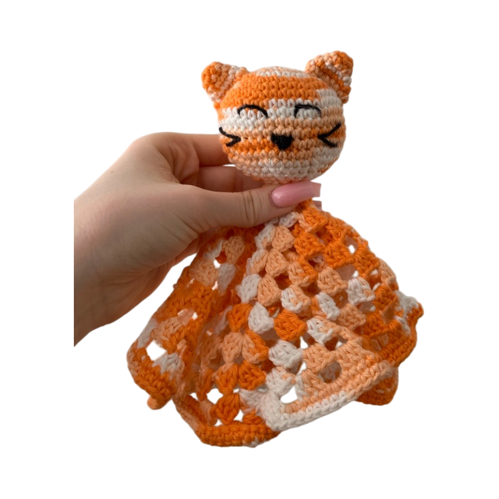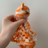 Itse virkattu oranssi-valkoinen vauvan pehmolelu-/uniriepu.