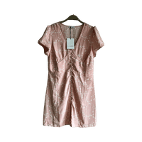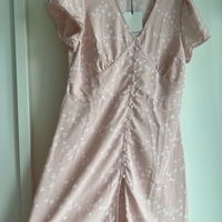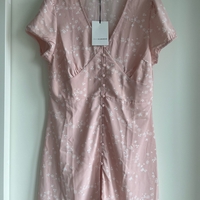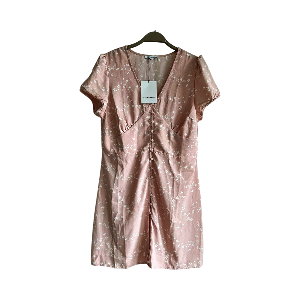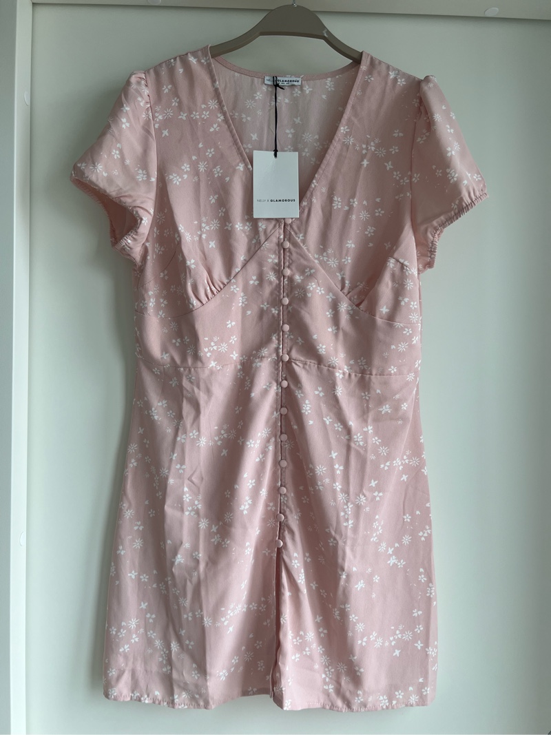 Uusi Nelly x Glamorous vaaleanpunainen kukkamekko jossa edessä napit. Koko 42 mutta vastaa paremmin kokoa 40.