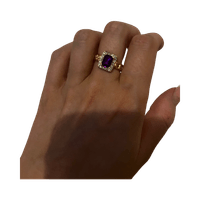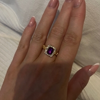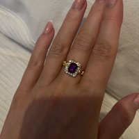 Kultainen sormus violettilla keskikivellä ja kirkkailla kivillä.