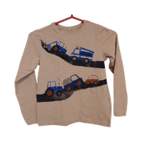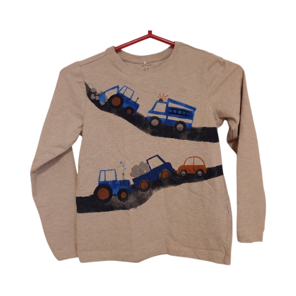 Beige pitkähihainen lasten paita, ajoneuvokuvio edessä. Kokoa 122-128. Käyttämätön.