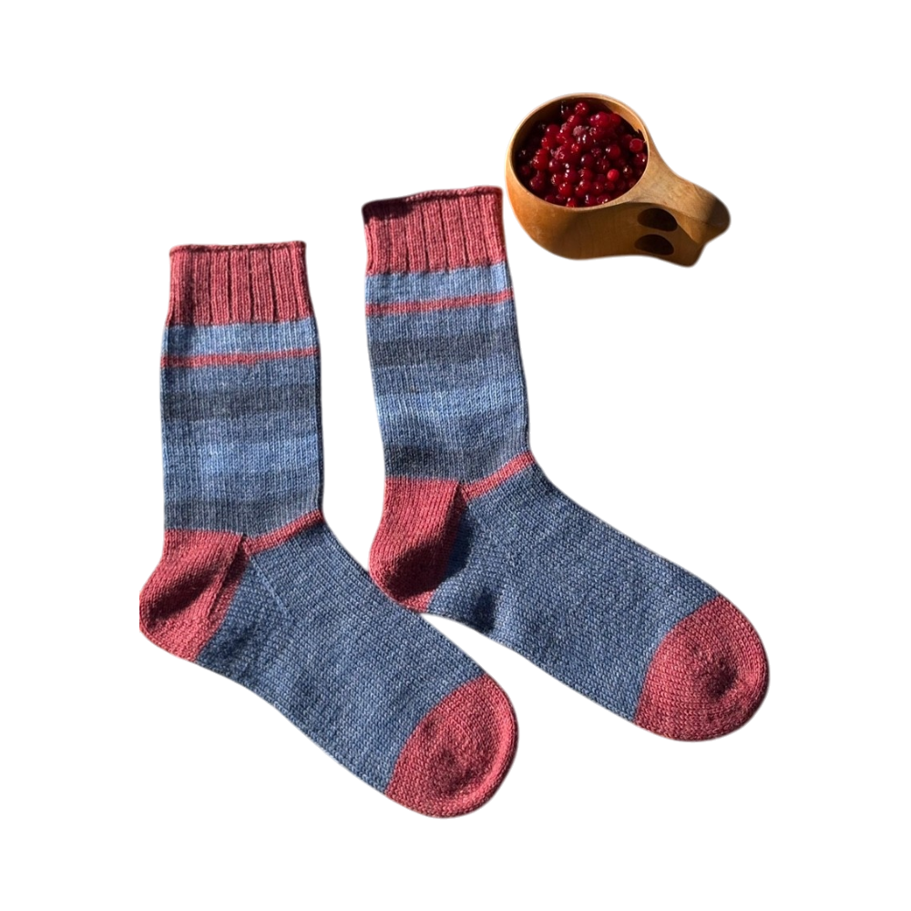 Käsinneulotut villasukat, sininen runko ja punaiset kantapäät.
