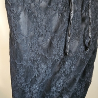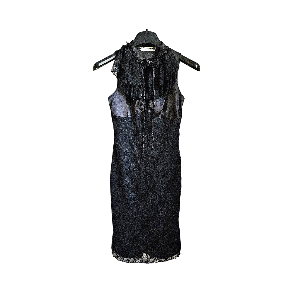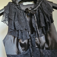 A stunning Italian designer dress with delicate lace, soft satin and dramatic layered ruffles. Elegant fitted silhouette with a romantic gothic neckline. Perfect for parties, holidays, theatre nights or evening events.